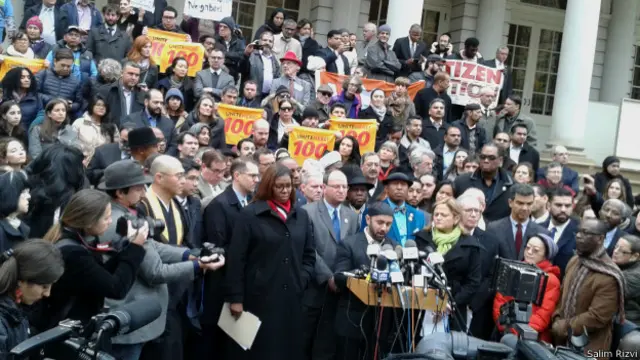 इस सिलसिले में बुधवार को न्यूयॉर्क के सिटी हॉल के बाहर शहर काउंसिल की स्पीकर मलिसा मार्क-वेवरितो की अगुआई में कई धर्मगुरु और नेताओं समेत क़रीब 200 लोग ट्रंप का विरोध करने पहुंचे.