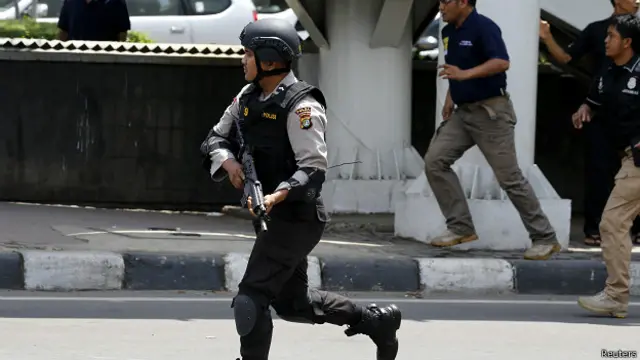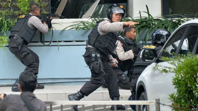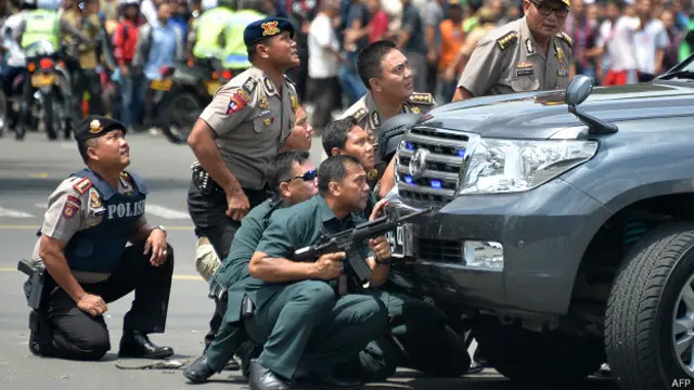 जकार्ता में सरीना शॉपिंग सेंटर के बाहर शुरुआती धमाके के बाद ही हथियारबंद पुलिस, स्नाइपर्स और बख़्तरबंद गाड़ियां पहुँच गई थीं.