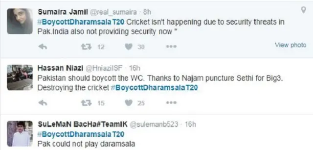 एक यूज़र आयशा बलोच ने ट्वीट किया, "अगर भारत पाकिस्तान क्रिकेट टीम को सुरक्षा नहीं दे सकता, तो पाकिस्तान को मेहमान नहीं बनना चाहिए."