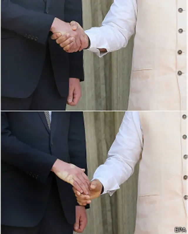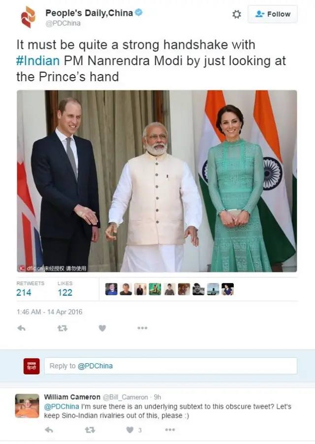 पीपुल्स डेली चाइना @PDChina ने यह तस्वीर यह कहते हुए ट्वीट की है कि ये भारतीय प्रधानमंत्री नरेंद्र मोदी का सबसे ताक़तवर हैंडशेक है. राजकुमार के हाथ को देखकर यही लगता है.