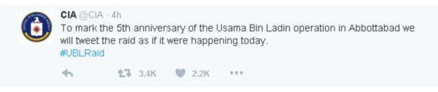 सीआईए ने अपने ट्विटर हैंडल @CIA से ट्वीट किया है, "ओसामा बिन लादेन की मौत की पांचवीं बरसी पर ऐबटाबाद में हुई कार्रवाई को हम ऐसे ट्वीट करेंगे मानों वह सब आज ही हुआ हो."