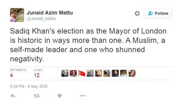 एक अन्य ट्विटर यूज़र ज़ुनैद अज़ीम ने ट्वीट किया, ''लंदन के मेयर के रूप में सादिक़ खान का चुना जाना इतिहास है. एक मुस्लिम, अपनी मेहनत से सफल हुआ, एक आदमी जो नकारात्मकता से दूर है.''