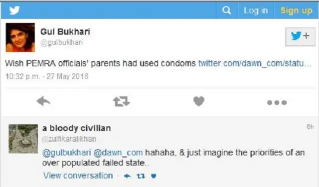 गुल बुख़ारी ने ट्वीट किया, “काश पेमरा अफ़सरों के माता-पिता ने कंडोम का इस्तेमाल किया होता.”