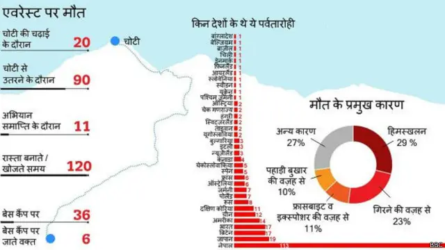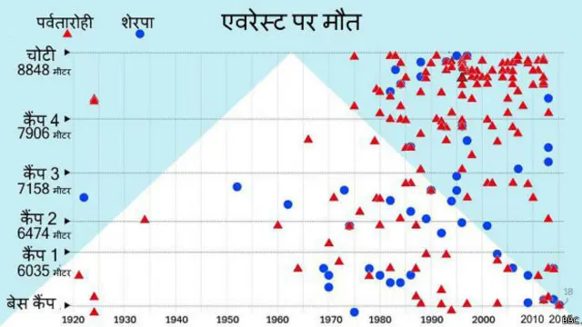 सबसे ज़्यादा मौतें, एवरेस्ट की चोटी के क़रीब के हिस्से में होती हैं. ये इलाक़ा 'डेथ ज़ोन' के नाम से बदनाम है. लोग अक्सर चढ़ाई की तैयारी करते वक़्त ग़लतियां करके जान गंवाते हैं. वैसे एवरेस्ट पर मरने वालों की बड़ी तादाद जीत हासिल करके लौट रहे लोगों की भी है.
