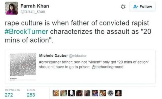 एक ट्विटर यूजर फ़राह ख़ान ने लिखा, “बलात्कार संस्कृति उसे कहते हैं जब दोषी बलात्कारी ब्रोक टर्नर के पिता हमले को ’20 मिनट का काम’ बताते हैं.”