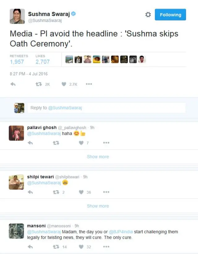 मंत्रिमंडल विस्तार से पहले सुषमा ने मीडिया को संबोधित करते हुए ट्वीट किया, "कृपया इस हेडलाइन से बचें- शपथ ग्रहण समारोह में नहीं आईं सुषमा."