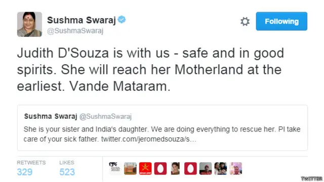 हालांकि सुषमा स्वराज ने अभी ये नहीं बताया है कि जूडिथ डिसूजा अगवा करने वालों की कैद से कैसे छूटीं.