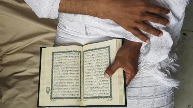 सऊदी अरब के पवित्र शहर मक्का में एक मुस्लिम अहराम पहने हुए (हज के दौरान पहना जाने वाला कपड़ा) हरम शरीफ़ के अंदर क़ुरान पढ़ते हुए.