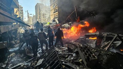 इमेज कैप्शन, बेरूत के कॉर्निश अल-मज़रा इलाके़ में 8 अप्रैल को हुए इसराइली हवाई हमले के बाद मलबे के बीच खड़े राहत और बचाव कर्मी