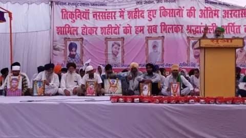 यहाँ तीन अक्टूबर को हुई हिंसा में मारे गए किसानों और किसान पत्रकार रमन कश्यम को श्रद्धांजलि दी जा रही है.
