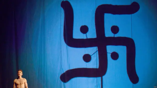 जर्मनी के वायमार में 'गणेश वर्सस द थर्ड रीख' नाटक के रिहर्सल के दौरान कलाकार ब्रायन टिली गणेश की वेशभूषा में मंच पर पेश हुए. उनके साथ मंच पर थे सायमन लाहर्टी.