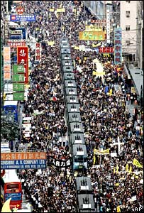 हॉन्गकॉन्ग में पूर्ण लोकतंत्र लागू करने की माँग करते हुए हज़ारों लोगों ने सड़कों पर प्रदर्शन किया है. इस प्रदर्शन में मज़दूर संगठनों, मानवाधिकार गुटों के सदस्यों के अलावा बड़ी संख्या में आम नागरिकों ने हिस्सा लिया, इनमें से कुछ लोगों ने चीन विरोधी नारों वाली तख़्तियाँ थाम रखी थीं. हॉन्गकॉन्ग चीन के अधीन एक स्वायत्त क्षेत्र है, अब इन प्रदर्शनकारियों की माँग है कि देश के अगले शासक का फ़ैसला आम चुनाव के ज़रिए हो. हॉन्गकॉन्ग में एक चुनाव समिति होती है जिसे चीनी सरकार गठित करती है और यही समिति तय करती है कि देश का नेतृत्व कौन करेगा. वर्ष 2003-2004 में भी वहाँ ऐसे ही प्रदर्शन हुए थे जिनके बाद चीनी सरकार चुनाव समिति के सदस्यों की संख्या बढ़ाकर 800 कर दी थी. लेकिन प्रदर्शनकारियों की माँग है कि हॉन्गकॉन्ग के शीर्ष नेता का चयन पूरी तरह से जनता करे न कि चीन के चुने हुए 800 लोग. बड़ा प्रदर्शन हॉन्गकॉन्ग स्थित बीबीसी संवाददाता क्रिस हॉग का कहना है कि प्रदर्शन में बहुत बड़ी संख्या में लोग शामिल हुए, जितनी उम्मीद की जा रही थी उससे कहीं अधिक. इस प्रदर्शन में हिस्सा ले रहे एन्सन चान ने कहा, "आपके जीवन में कभी-कभी ऐसे मौक़े आते हैं जब आपको किसी मुद्दे के समर्थन या विरोध में खड़ा होना ही पड़ता है." अपनी चार वर्ष की बेटी के साथ प्रदर्शन में हिस्सा लेने वाले पालू चान्ग ने कहा, "मैं चाहता हूँ मेरी बेटी देखे और याद रखे कि लोकतंत्र के लिए, आने वाली पीढ़ी के लिए हमने संघर्ष किया." बीबीसी संवाददाता का कहना है कि प्रदर्शन का आयोजन करने वाले चीनी नेताओं को स्पष्ट संदेश देना चाहते हैं कि वहाँ जनमत पूर्ण लोकतंत्र से कम पर समझौता करने को तैयार नहीं है. | इससे जुड़ी ख़बरें हांगकांग में लोकतंत्र के लिए बड़ा प्रदर्शन01 जुलाई, 2004 | पहला पन्ना हाँगकाँग में बड़ा प्रदर्शन01 जुलाई, 2003 | पहला पन्ना | |||||||||||||||||||||||||||||||||||||||||||||||||||||||||||||||||||||||||||||||||||||||||||||