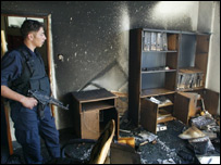 जब इस कार्यालाय में आग लगाई गई तब प्रधानमंत्री इस्माइल हानिया वहां मौजूद नहीं थे. वो उस समय गज़ा पट्टी में थे. गज़ा में हमास और फ़लस्तीनी नेता अब्बास के समर्थकों के बीच हिंसक झड़पें हुई थीं जिसमें दो लोगों की मौत हो गई थी और 15 लोग घायल हो गए थे. ये झड़पें उस समय शुरु हुई जब एक हमास समर्थक का जनाज़ा निकल रहा था. इस घटना के बाद हमास के लड़ाकों ने फ़लस्तीनी सुरक्षा बलों के परिसर पर ग्रेनेड दागे जिसके जवाब में रमल्लाह में संसद और प्रधानमंत्री कार्यालय पर हमला किया गया. | इससे जुड़ी ख़बरें 'अब्बास-हमास के बीच टकराव'11 जून, 2006 | पहला पन्ना ग़ज़ा में इसराइल का बड़ा हवाई हमला08 जून, 2006 | पहला पन्ना 'निर्दोष फ़लस्तीनीयों की मौत की जाँच'22 मई, 2006 | पहला पन्ना हमास रुख़ में बदलाव करे:इसराइल10 मई, 2006 | पहला पन्ना फ़लस्तीनी इलाक़ों में नए सुरक्षाकर्मी17 मई, 2006 | पहला पन्ना हमास अधिकारी से 'बड़ी धनराशि ज़ब्त'19 मई, 2006 | पहला पन्ना फ़लस्तीनी प्रशासन और हमास19 मई, 2006 | पहला पन्ना हमास का एक शीर्ष चरमपंथी गिरफ़्तार23 मई, 2006 | पहला पन्ना | |||||||||||||||||||||||||||||||||||||||||||||||||||||||||||||||||||||||||||||||||||||||||||||