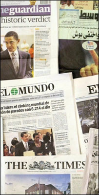 दुनिया भर में आज के अख़बारों को देख कर लगा कि जैसे वे इस ऐतिहासिक लम्हे को सबसे शानदार शब्दों में दर्ज करने के लिए एक दूसरे से होड़ लगा रहे हों 1969 में चाँद पर पहला क़दम रखते हुए अंतरिक्ष यात्री नील आर्मस्ट्रांग ने कहा था, 'वन जाइंट लीप फॉर मैनकाइंड' यानी ये मानवता के लिए एक लंबी छलांग है, कई दशकों बाद यही वाक्य ओबामा की जीत पर दोहराया है लोकप्रिय ब्रितानी अख़बार 'द सन' ने. वहीं एक अन्य ब्रितानी अख़बार इंडिपेंडेंट ने पूरे पेज पर ओबामा की एक तस्वीर छापी है और नीचे सिर्फ़ दो शब्द लिखे हैं- 'मिस्टर प्रेसिडेंट.' द टाइम्स ने चुनाव प्रचार के दौरान ली गई ओबामा के पूरे परिवार की तस्वीर छापी है और हेडलाइन दी है 'दिस इज़ आवर टाइम.' अमरीका के अखबारों पर नज़र डालें तो न्यूयॉर्क टाइम्स ने लिखा है कि ओबामा रंगभेद की दीवार को गिराकर राष्ट्रपति बने हैं. वहीं वाशिंगटन पोस्ट की सुर्खी है 'चेंज हैज़ कम' यानी बदलाव आ गया है, 'चेंज' ओबामा के चुनाव अभियान का मुख्य मुद्दा था. फ्रांस के सबसे प्रमुख अख़बार ला मॉंड ने फ्रांसीसी भाषा में ओबामा को अमरीका का नया सपना बताया है और लिखा है ओबामा ने अमरीका के लिए नया सपना देखा है, उनका इशारा रंगभेद विरोधी नेता मार्टिन लूथर किंग के मशहूर भाषण 'आई ड्रीम'की ओर था जो दशकों से रंगभेद विरोधी आंदोलन का प्रेरणास्रोत रहा है. वहीं अफ्रीका तो जैसे ओबामा की इस जीत पर खुशी से झूमता नज़र आ रहा है. जमैका के एक अख़बार जमैका ग्लीनर की सुर्खी है-'यस ही डिड इट' यानी हाँ उसने कर दिखाया. ओबामा मूल रूप से कीनिया के हैं तो ज़ाहिर है कीनिया के अख़बार भला पीछे कैसे रहते. कीनिया के डेली नेशन अख़बार ने लिखा है 'कीनिया में उनके नाम की एक छुट्टी और नाच-गाना' ईरान के अख़बार ईरान डेली ने इसे पहले पृष्ठ पर तो छापा लेकिन अपनी सबसे बड़ी सुर्खी के रूप में नहीं, और लिखा 'दुनिया को कम अहंकारी अमरीका की उम्मीद.' वहीं अफगानिस्तान के अफगान डेली ने ओबामा की जीत का स्वागत किया है लेकिन सुर्खी में साथ ही ये भी लिखा है कि उन्हे ओबामा से उम्मीद है कि वे अफ़ग़ानिस्तान पर तवज्जो देंगे. |