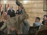 अमरीकी राष्ट्रपति जॉर्ज बुश पर जूता फेंकने वाले इराक़ के पत्रकार मुंतज़िर अल ज़ैदी के मामले की सुनवाई टाल दी गई है. 31 दिसंबर को उनके मामले की सुनवाई होनी थी लेकिन उनके ख़िलाफ़ आरोप तय न होने पाने के कारण सुनवाई टाल दी गई. इराक़ के केंद्रीय आपराधिक अदालत के एक प्रवक्ता ने बताया कि ज़ैदी की सुनवाई उनके वकील के अनुरोध के बाद टाली गई है और सुनवाई की तारीख़ बाद में तय की जाएगी. ग़ौरतलब है कि विदेशी राष्ट्राध्यक्ष पर हमले के आरोप में उन्हें 15 साल की सज़ा हो सकती है. यदि उन पर एक विदेशी नेता का अनादर करने का आरोप लगाया जाता है तो इसमें केवल दो वर्ष की सज़ा का प्रावधान है. वकील की दलील मुंतज़िर अल ज़ैदी के वकील का कहना था कि उनकी अपील का आधार ये है कि वे इराक़ में अमरीका की उपस्थिति का विरोध कर रहे थे और उनके क़दम से राष्ट्रपति बुश को कभी गंभीर ख़तरा उत्पन्न नहीं हुआ. समाचार एजेंसी रॉयटर से बातचीत में ज़ैदी के वकील दिया अल सादी ने कहा,'' आपने कभी सुना है कि किसी की जूते से मौत हुई हो?'' उनका कहना था,'' यूरोप में अपमानित करने के लिए लोग अंडे और सडे हुए टमाटर फेंकते हैं, इराक़ में ऐसा करने के लिए जूते फेंके जाते हैं.'' इसके पहले सुरक्षा विशेषज्ञों ने विस्फोटक होने की संभावना को जाँचने के लिए जूतों को नष्ट कर दिया था. मुंतज़िर अल ज़ैदी के वकील ने इसकी कड़ी आलोचना की थी. उनका कहना है कि वह कोई मामूली जूता नहीं था बल्कि इराक़ियों की नज़र में वह उनके प्रतिरोध का प्रतीक था. इस जूते को ख़रीदने के लिए इराक़ी फुटबॉल टीम के पूर्व कोच और एक सऊदी नागरिक ने लाखों डॉलर की बोलियाँ लगाई थीं. ग़ौरतलब है कि मुंतज़िर अल ज़ैदी ने बग़दाद में एक संवाददाता सम्मेलन के दौरान अमरीकी राष्ट्रपति के ऊपर अपने दोनों जूते बारी-बारी से चलाए थे लेकिन वो उन्हें लगे नहीं थे, इसके बाद उन्हें गिरफ़्तार कर लिया गया. मुंतज़िर ज़ैदी इराक़ी और अरब जनता के बीच हीरो बन गए हैं और उनकी रिहाई की माँग करते हुए कई प्रदर्शन हो चुके हैं. |