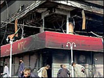 उल्लेखनीय है कि इससे पहले भी कराची में केएफ़सी और मैकडोनल्ड जैसे अमरीकी फ़ास्ट फ़ूड रेस्तराँ को बम हमलों को निशाना बनाया जा चुका है. इसी साल मई में कराची में एक केएफ़सी रेस्तराँ में आग लगाए जाने की घटना में छह लोगों की मौत हो गई थी, जबकि सितंबर में भी एक मैकडोनल्ड और एक केएफ़सी रेस्तराँ में हुए बम धमाकों में कई लोग घायल हो गए थे. | इससे जुड़ी ख़बरें हमले में सुन्नी मौलवी घायल, बेटे की मौत18 जुलाई, 2005 | भारत और पड़ोस कराची में टेस्ट नहीं खेलेगा इंग्लैंड05 जुलाई, 2005 | खेल कराची में मौलवी के क़त्ल के बाद एलर्ट24 जून, 2005 | भारत और पड़ोस कराची में मस्जिद में गोलीबारी03 नवंबर, 2004 | भारत और पड़ोस कराची बम धमाकों में नौ की मौत08 अगस्त, 2004 | भारत और पड़ोस कराची में कार में विस्फोट, दो की मौत07 अगस्त, 2004 | भारत और पड़ोस | ||||||||||||||||||||||||||||||||||||||||||||||||||||||||||||||||||||||||||||||||||||||||||