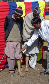 जम्मू के पहाड़ी ज़िले पुँछ में हमीरपुर स्थित सेना की एक छावनी में बैठी दो बहनें 20 वर्षीया गुलाब जान और 30 वर्षीया फ़ातिमा जान कड़ाके की ठंड में चेहरे पर उम्मीद भरा उत्साह लिए बैठी हैं. कारण यह है कि यहाँ सेना ने एक शिविर का आयोजन किया है जहाँ लोगों को मुफ़्त में नक़ली टाँगे दी जा रही हैं. छोटी बहन की दाईं और बड़ी बहन की बाईं टाँग कट चुकी है. मैंने गुलाब जान के पास जाकर पूछा कि यह कैसे हुआ तो वो एकदम से रोने लगी और उसे चुप कराते हुए उसकी बड़ी बहन भी रो पड़ी. अपने आँसू पूछते हुए गुलाब जान बोली, "ये 2000 की बात है. नियंत्रण-रेखा के पास शाहपुर गाँव में हमारे घर के पास गोबर के ढेर में पाकिस्तान से आए चरमपंथियों ने बम (बारूदी सुरंग) रखा था. सुबह जब हम बाहर थे तो वो फट गया और चारों ओर अँधेरा छा गया." इसके बाद जब आँख खुली तो गुलाब जान, फ़ातिमा जान और उनकी माँ मारिया बी अस्पताल में थे और तीनों की एक-एक टाँग इस विस्फोट की वजह से बेकार हो चुकी थी. "हमारे लिए तो ये सबसे बड़ा कहर था." गुलाब जान फिर रोते हुए कह रही थी. उसके पिता, अहमद दीन अपने गाँव के सरपंच थे. दोनों बहनें और माँ तीन महीने तक अस्पताल में रहीं और फिर उन्हें घर लाया गया. उस समय गुलाब जान 13 साल की थी और छठी कक्षा में थी जबकि उसकी बड़ी बहन फ़ातिमा की सगाई हो चुकी थी और तीन महीने बाद उसकी शादी थी. लेकिन एक पल में इस धमाके ने इन तीनों को बैसाखियों पर चलने पर मज़बूर कर दिया. फ़ातिमा जान उस पल को याद करते हुए बोली,"हमारे वालिद(पिता) इस सदमे को बर्दाश्त नहीं कर पाए और चल बसे. अब मानो हमारे लिए सब कुछ ख़त्म हो गया." गुलाब जान की पढ़ाई छूट गई क्योंकि स्कूल दूर था और वहाँ तक चल कर जाना संभव नहीं था. गुज़ारे के लिए ये माँ और बेटियाँ बैसाखियों पर ही अपने खेत में घास वगैरह काटकर और अन्य छोटे काम कर के कुछ काम कर लेती. फ़ातिमा के ससुराल वाले भी भले लोग थे वो उसे शादी करके ले गए और फ़ातिमा को तीन बच्चे भी हुए. "लेकिन अभी बच्चे छोटे-छोटे ही थे कि चरमपंथियों ने मेरे पति को मार डाला." फ़ातिमा अपनी शॉल से आँसू पोछते हुए बोली. उम्मीद अब इस शिविर के बारे में जब पता चला तो दोनों मानो नए जीवन की तलाश में यहाँ पहुँच गए. सेना ने ये शिविर ग़ैर सरकारी संस्थानों की सहायता से लगाया है. लोगों को पहले भी ग़ैर सरकारी संस्थाएँ नकली टाँगें देती थीं लेकिन इसके लिए उन्हें जयपुर और दिल्ली जाना पड़ता था.