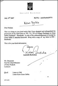 ज़मीन से संबंधित विवाद से जया बच्चन भी जुड़ी हुई हैं. बच्चन परिवार यहाँ पर एक फ़ार्म हाउस बनाना चाहता था. ख़ुद को किसान बताने के लिए उन्होंने जो काग़ज़ात जमा किए उनमें बताया गया था कि अमिताभ बच्चन बाराबंकी में एक भूखंड के मालिक हैं जो कृषि कार्य में इस्तेमाल होती है. ज़मीन के दस्तावेज़ के मुताबिक़ 11 जनवरी, 1983 से अमिताभ इस ज़मीन के मालिक हैं. इस दस्तावेज़ को जाँच के लिए संबंधित अधिकारी ने बाराबंकी के कलेक्टर के कार्यालय भेजा. तत्कालीन कलेक्टर ने इसकी जाँच की और पाया कि यह बात मूल दस्तावेजों में बाद में दर्ज की गई थी. जाँच में यह भी कहा गया कि जिस स्याही से अमिताभ का नाम सरकारी कागज़ों में दर्ज है वो नई है और लिखावट भी दूसरी है. इसके बाद संबंधित लेखपाल को बर्ख़ास्त कर दिया गया और इसे फ़र्ज़ी चकबंदी घोषित करते हुए निरस्त कर दिया गया. यह भी आरोप लगे कि अमिताभ को इस मामले में राज्य की तत्कालीन सरकार से अच्छे संबंधों के चलते यह लाभ मिला. हालांकि बाद में कलेक्टर बदलने के बाद अमिताभ को कुछ राहत मिली और उन्हें इस मामले में पेश होकर अपनी बात रखने का मौका दिया गया. वैसे इसी ज़मीन को लेकर एक और विवाद भी बच्चन परिवार के साथ जुड़ा है. वर्ष 2006 में जब जया बच्चन ने राज्यसभा सदस्यता के लिए अपना नामांकन दाखिल किया था तो उसके साथ जमा किए गए संपत्ति के ब्यौरे में इस ज़मीन का उल्लेख नहीं था. इस मामले पर चुनाव आयोग में एक याचिका दायर है जिस पर सुनवाई हो रही है. |