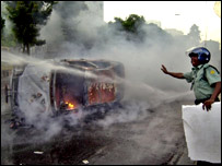 बुधवार को हुई हिंसा के बाद बांग्लादेश की राजधानी ढाका और पाँच अन्य शहरों में स्थिति शांतिपूर्ण है. लेकिन इन शहरों में अभी भी कर्फ़्यू जारी है. बुधवार को इन शहरों में छात्रों और पुलिस के बीच हिंसक झड़पें हुई थी. राजधानी ढाका में दूकानें बंद हैं और ज़्यादातर दफ़्तरों में भी कामकाज प्रभावित हुआ है. बांग्लादेश की सरकार स्थिति को नियंत्रित करने की कोशिश कर रही है. सोमवार को बांग्लादेश के कई इलाक़ों में हिंसा भड़क उठी थी जिसमें एक व्यक्ति की मौत हो गई थी और 30 अन्य घायल हो गए थे. ताज़ा हिंसा ढाका विश्वविद्यालय से फैली. छात्र देश से आपातकाल हटाने की मांग कर रहे थे. इस साल जनवरी में सेना के समर्थन से चल रही अंतरिम सरकार ने आपातकाल लगा दिया गया था. बीबीसी संवाददाता का कहना है कि सत्ता संभालने के बाद पहली बार अंतरिम सरकार को इतने बड़े पैमाने पर चुनौती का सामना करना पड़ रहा है. स्थिति बुधवार रात आठ बजे से राजधानी ढाका में कर्फ़्यू लगाया गया था. वहाँ फ़िलहाल स्थिति शांतिपूर्ण है. सड़कों पर सेना गश्त लगा रही है.