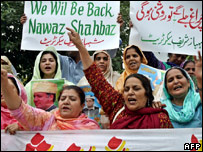 नवाज़ शरीफ़ और उनके परिवार के 40 सदस्यों को सऊदी अरब निर्वासित कर दिया गया. माना जाता है कि ये समझौता 10 साल के लिए था. नवाज़ शरीफ़ का जन्म 1949 में लाहौर में हुआ. वे राष्ट्रीय स्तर पर प्रमुखता में तब आए जब जनरल ज़िया के सैनिक शासन के दौरान वे पंजाब सरकार में शामिल हुए. वे पहले वित्त मंत्री और फिर मुख्यमंत्री बने. इस दौरान वे काफ़ी बेहतरीन प्रशासक साबित हुए. फिर 1990 में वे पाकिस्तान के प्रधानमंत्री बने लेकिन 1993 में ही उनकी सरकार को बर्ख़ास्त कर दिया गया. उनकी जगह बेनज़ीर भुट्टो प्रधानमंत्री बनी. वर्ष 1997 को नवाज़ शरीफ़ एक बार फिर प्रधानमंत्री चुने गए और उन्हें बहुमत हासिल हुई. इस दौरान उन्होंने कई संवैधानिक बदलाव किए. माना जा रहा है कि इन बदलावों का मकसद ये था कि उनके शासन के ख़िलाफ़ कोई आवाज़ न उठाए. नवाज़ शरीफ़ ने उस संवैधानिक संशोधन को भी पल्ट दिया जिसके तहत राष्ट्रपति देश के प्रधानमंत्री को बर्ख़ास्त कर सकता था. इस दौरान तत्कालीन प्रमुख न्यायाधीश सज्जाद अली शाह के साथ भी नवाज़ शरीफ़ के साथ अनबन शुरु हो गई. सेना के साथ टकराव सेना के साथ भी उनका तनाव बढ़ता जा रहा था. 1998 में सेना के एक पूर्व प्रमुख ने कहा कि सरकार चलाने में सेना की भूमिका होनी चाहिए. 1999 में नवाज़ शरीफ़ ने भारतीय प्रशासित कश्मीर से पाकिस्तान समर्थित लड़ाकों को वापस बुला लिया. उसी वर्ष जनरल परवेज़ मुशर्रफ़ ने तख़्ता पलट दिया और देश के राष्ट्रपति बन गए जिससे ये साबित हुआ कि पाकिस्तान में सेना का प्रभाव करने की कोशिश किसी भी राजनेत के लिए कितनी घातक साबित हो सकती है. सक्रिय राजनीति से हटने के बाद नवाज़ शरीफ़ की पार्टी पाकिस्तान मुस्लिम लीग में मतभेद सामने आने लगे. नवाज़ शरीफ़ की पत्नी समेत कई नेताओं ने विपक्षी गठबंधन बनाकर सेना के ख़िलाफ़ मोर्चा खोलने की बात उठाई लेकिन इसका मतलब होता बेनज़ीर भुट्टो के साथ हाथ मिलाना. पाकिस्तान मुस्लिम लीग के कई नेताओं को बात पसंद नहीं आई. नवाज़ शरीफ़ के निर्वासन के बाद उनकी पार्टी के दो फाड़ हो गए. शुजात हुसैन समेत पाकिस्तान मुस्लिम लीग के कई नेता जनरल मुशर्रफ़ के साथ हो लिए. वर्ष 2002 में हुए आम चुनाव में इन्हीं नेताओं ने पीएमएल-क्यू( क़ैद ए आज़म) पार्टी बनाई जो मुशर्रफ़ का समर्थक मानी जाती है. पीएमएल-क्यू को 2002 में सरकार बनाने के लिए चुना गया हालांकि इसमें बड़े स्तर पर धाँधली के आरोप लगाए गए. उसके बाद से सेना के नेतृत्व वाले प्रशासन के लिए पीएमएल-क्यू मुख्य पार्टी की तरह काम करती रही है. कई लोगों को नवाज़ शरीफ़ की पाकिस्तान वापसी से काफ़ी उम्मीदें थी लेकिन उनको दोबारा निर्वासित किए जाने से खेल फिर बदल गया है. | इससे जुड़ी ख़बरें नवाज़ के निर्वासन को क़ानूनी चुनौती10 सितंबर, 2007 | भारत और पड़ोस 'सरकार ने स