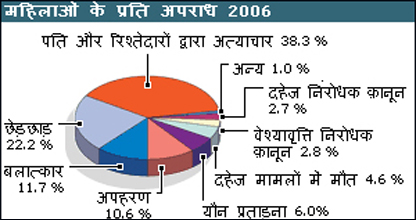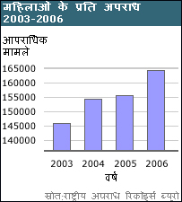 36617 बदसलूकी के मामले, 19348 बलात्कार, 17414 अपहरण, 7618 दहेज से जुड़े मामलों में मौतें और 63128 प्रताड़ना के मामले -राष्ट्रीय अपराध रिकॉर्ड्स ब्यूरो की ताज़ा रिपोर्ट (वर्ष 2006) के आँकड़े भयावह तस्वीर पेश करते हैं. वर्ष 2006 में महिलाओं के प्रति अपराध के कुल एक लाख 64 हज़ार 765 मामले दर्ज किए गए. वर्ष 2005 में 1,55,553 मामले दर्ज हुए यानि वर्ष 2005 के मुकाबले 2006 में 5.9 फ़ीसदी को बढ़ोत्तरी. और 2002 के मुकाबले 15.2 की वृद्धि. बलात्कार भारत में इस समय सबसे तेज़ी से बढ़ता अपराध है. एक अनुमान के मुताबिक 1971 के बाद से बलात्कार की घटनाओं में 678 फ़ीसदी की बढ़ोत्तरी हुई है. राष्ट्रीय रिकॉर्ड्स अपराध ब्यूरो की नई रिपोर्ट में अगर बलात्कार करने वालों के प्रोफ़ाइल का अध्ययन करें तो परेशान करने वाले तथ्य सामने आते हैं. रिपोर्ट के मुताबिक बलात्कार करने वालों में से 75 फ़ीसदी लोग जान-पहचान वाले होते हैं जिसमें परिवार के सदस्य, अभिभावक, पड़ोसी और रिश्तेदार शामिल हैं. महज़ आँकड़ें नहीं हैं ये...