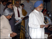 नायर के मुताबिक़ कलाम ने सोनिया गांधी से कहा था कि आप अगले दिन का इंतज़ार क्यों करना चाहती हैं...मैं आज शाम को ही आपसे मिल लूँगा. दूसरे दिन यानी 19 मई 2004 को ये संदेश आया कि सोनिया गांधी रात सवा आठ बजे राष्ट्रपति से मिलने आएँगी. एक बार फिर एक दूसरे कमरे में नायर बेसब्री से इसका इंतज़ार कर रहे थे कि कब उन्हें कलाम पत्र के साथ हाज़िर होने को कहें. नायर को बुलाया भी गया लेकिन कलाम ने उनसे कहा कि मनमोहन सिंह को कांग्रेस संसदीय पार्टी का नेता चुना गया है और अन्य पार्टियों का पत्र भी आ गया है. नायर अपने पत्र के साथ वापस आए क्योंकि उस पर सोनिया गांधी का नाम लिखा हुआ था. नाम बदला गया और फिर मनमोहन सिंह को नियुक्त पत्र सौंपा गया. एपीजे अब्दुल कलाम वर्ष 2002 से 2007 तक भारत के राष्ट्रपति रहे. |
