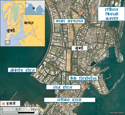 जुलाई 2006 के मुंबई ट्रेन धमाकों के बाद 26 नवंबर की रात महानगर एक बार फिर दहल उठा. हमलावरों ने पाँच सितारा होटलो, अस्पतालों और रेलवे स्टेशन को निशाना बनाकर अंधाधुंध गोलियाँ चलाईं. उन्होंने कई स्थानों पर लोगों को बंधक भी बना लिया. हमलावरों की सही संख्या का पता नहीं चल सका है लेकिन सुरक्षाबलों ने कम से कम नौ हमलावरों को गिरफ़्तार कर लिया है. इस हमले के निशानों के बारे में जानने के लिए नक्शे पर क्लिक करें. ताज महल होटल 105 साल पुरानी इमारत है. मुंबई की पहचान बन चुकी इस इमारत में महानगर के अमीर और संभ्रांत लोग आते-जाते रहते हैं. विदेशी पर्यटकों में भी गेटवे ऑफ़ इंडिया के पास स्थित ताज महल होटल काफ़ी लोकप्रिय है.