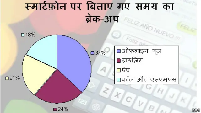 रिपोर्ट के अनुसार भारतीय अपने स्मार्टफ़ोन के साथ बिताए समय का एक चौथाई से भी कम भाग यानी करीब 18 प्रतिशत समय कॉल और एसएमएस पर लगाते हैं. वहीं 24 प्रतिशत समय ब्राउज़िंग और 21 प्रतिशत ऐप्स के प्रयोग में खर्च किए जाते हैं.