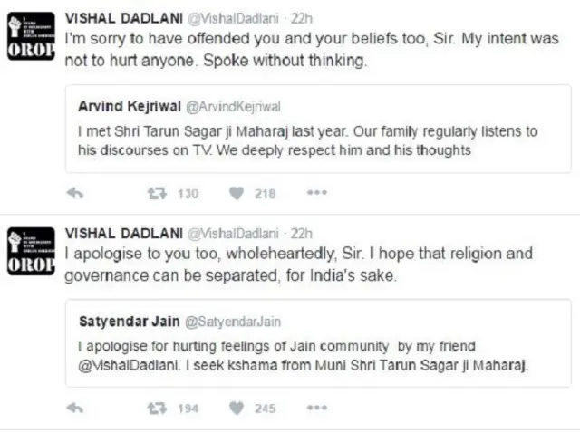 सत्येंद्र जैन ने ट्वीट किया, "मेरे मित्र विशाल डडलानी द्वारा जैन समुदाय की भावनाएं आहत करने के लिए मैं माफ़ी मांगता हूँ. मैं मुनि तरुण सागर जी महाराज से क्षमा मांगता हूँ."
