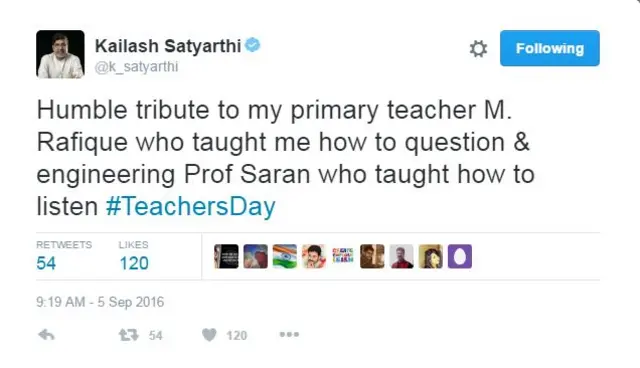 नोबेल पुरस्कार विजेता कैलाश सत्यार्थी ने भी अपने शिक्षकों का शुक्रिया अदा किया है.