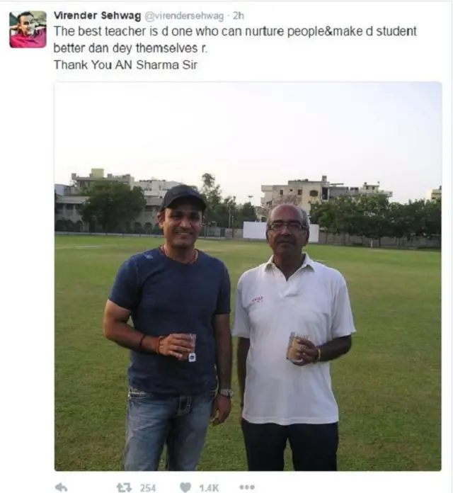 पूर्व टेस्ट क्रिकेटर वीरेंद्र सहवाग ने ट्वीट किया कि एक अच्छा शिक्षक अपने शिष्यों को ख़ुद से बेहतर बनाता है.