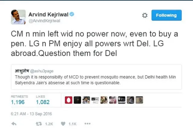 इसके जवाब में केजरीवाल ने लिखा, “अब मुख्यमंत्री और मंत्रियों के पास कोई अधिकार नहीं छोड़े हैं, एक पेन ख़रीदने का अधिकार भी नहीं. दिल्ली के मामले में प्रधानमंत्री और एलजी सभी अधिकारों का इस्तेमाल कर रहे हैं. एलजी विदेश में है. दिल्ली के बारे में उनसे सवाल करिए.”