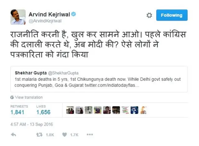 वरिष्ठ पत्रकार शेखर गुप्ता ने दिल्ली में डेंगू और चिकनगुनिया का मामला उठाया तो केजरीवाल ने ट्विटर पर सख़्त टिप्पणी कर उन्हें ‘दलाल’ कह दिया.