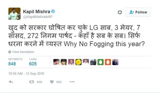 दिल्ली सरकार के मंत्री कपिल मिश्रा ने ट्वीट किया, “खुद को सरकार घोषित कर चुके एलजी साहब, 3 मेयर, 7 सांसद, 272 पार्षद- कहां हैं, सब के सब. सिर्फ़ धरना देने में व्यस्त. इस साल फॉगिंग क्यों नहीं हुई?”