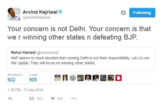 पत्रकार राहुल कंवल ने ट्वीट किया, “लगता है आप ने तय कर लिया है कि दिल्ली को चलाना उनकी ज़िम्मेदारी नहीं है. एलजी को ही दिल्ली चलाने देते हैं. वो अब दूसरे राज्यों पर फ़ोकस करेंगे.”