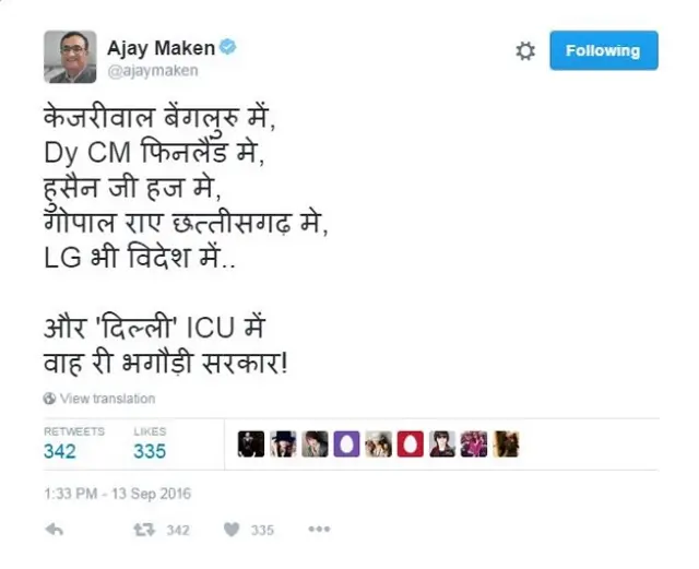 दिल्ली कांग्रेस के नेता अजय माकन ने भी केजरीवाल सरकार के अधिकतर मंत्रियों के दिल्ली से बाहर होने पर आम आदमी पार्टी की सरकार को घेरा है और ट्वीट किया, “दिल्ली आईसीयू में, वाह ही भगोड़ी सरकार!”