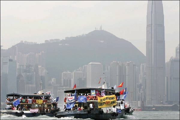 हाँगकाँग में तस्वीर में पीछे दिख रहे कॉन्फ़्रेन्स सेंटर में 13 दिसंबर 2005 से विश्व व्यापार संगठन की वार्ता आरंभ हुई. व्यापार नीतियों का बड़े पैमाने पर विरोध हो रहा है. पानी में नावों में बैठे लोग प्रदर्शनकारी हैं.