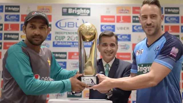 विश्व एकादश टीम की कप्तानी दक्षिण अफ्रीकी खिलाड़ी फफ डुप्लेसिस करेंगे तो वहीं पाकिस्तान की कप्तानी सरफ़राज़ ख़ान के हाथों में है. इसको लेकर हमारे सहयोगी मोहम्मद शाहिद ने पाकिस्तान में मौजूद बीबीसी उर्दू के संवाददाता अब्दुल रशीद शकूर से बात की. ख़ुद उन्हीं के शब्दों में जानिए पाकिस्तान में इस सीरीज़ के माहौल के बारे में.
