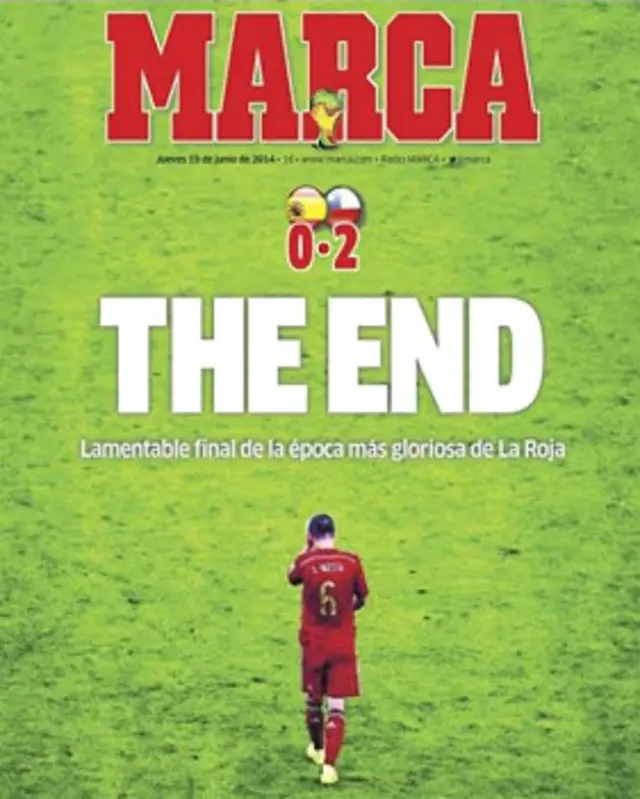 गुरुवार को स्पेन के एक दैनिक अख़बार मार्का ने बड़े-बड़े शब्दों में लिखा- द एंड. साथ में मैदान से हताश, परेशान और निराश होकर बाहर जाते आंद्रेस इनिएस्टा की तस्वीर भी लगी है.