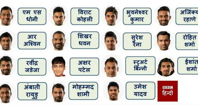 धोनी के अलावा टीम में शिखर धवन, रोहित शर्मा, अजिंक्य रहाणे, विराट <link type="page"><caption> कोहली</caption><url href="http://www.bbc.co.uk/hindi/sport/2014/12/141228_viart_kohli_australia_test_vr.shtml" platform="highweb"/></link>, सुरेश रैना, रविंद्र जडेजा, आर अश्विन, अंबाती रायडू, ईशांत शर्मा, मोहम्मद शामी, अक्षर पटेल, भुवनेश्वर कुमार, उमेश यादव और स्टुअर्ट बिन्नी को जगह मिली है.