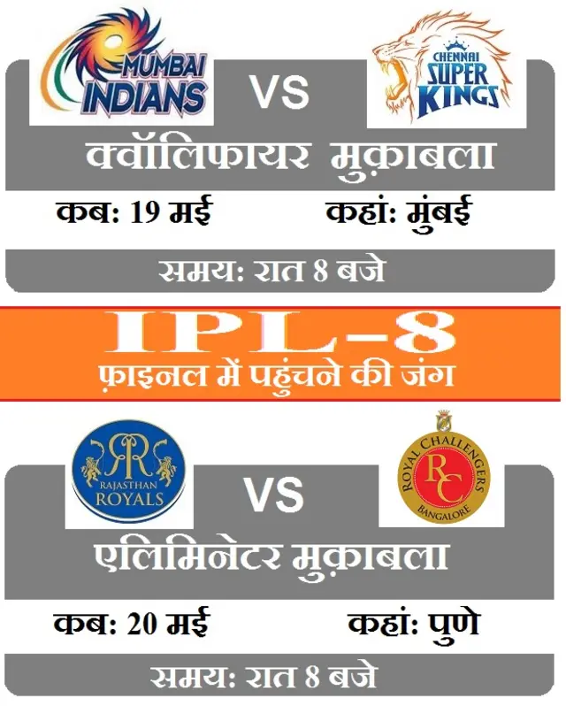 अब 19 मई को पहले क्लॉलिफायर में चेन्नई सुपरकिंग्स का सामना मुंबई इंडियंस से होगा जबकि 20 मई को एलिमिनेटर मुक़ाबले में राजस्थान रॉयल्स का सामना रॉयल चैलेंजर्स बंगलौर से होगा.