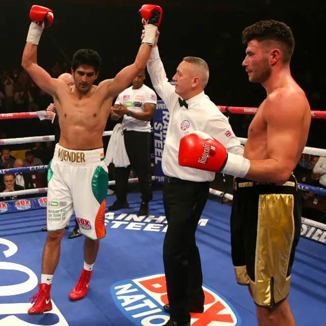 वहीं पूर्व केंद्रीय खेल मंत्री अजय माकन ने ट्विटर पर लिखा, "विजेंदर ने अपने प्रतिद्वंद्वी को नॉकआउट कर दिया !!! ज़बरदस्त!!!"