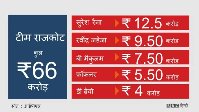 राजकोट के लिए सुरेश रैना, जेम्स फ़ॉकनर, रवींद्र जडेजा, ड्वेन ब्रावो और ब्रैंडन मैकुलम खेलेंगे.