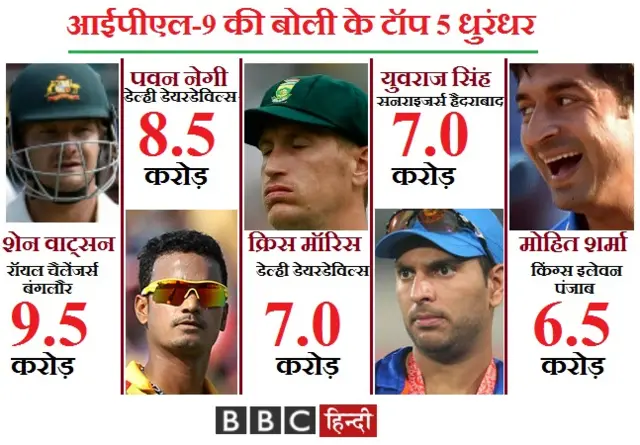 पवन नेगी को डेल्ही डेयरडेविल्स को 8.5 करोड़ रुपए में ख़रीदा, जबकि युवराज सिंह को सनराइजर्स हैदराबाद ने सात करोड़ रुपए में टीम में शामिल किया है.