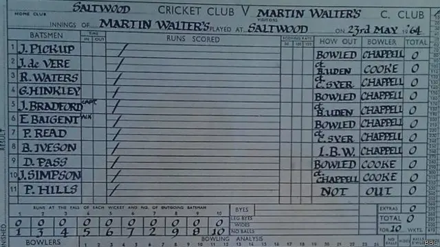 1964 में एक मैच के दौरान केंट विलेज की टीम साल्टवुड क्रिकेट क्लब ने 216 रन बनाने के बाद मार्टिन वाल्टर क्लब की पूरी टीम को शून्य पर आउट किया.