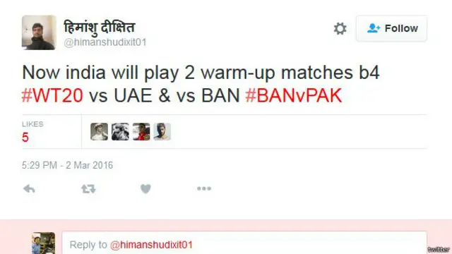 @himanshudixit01 हैंडल से हिमांशु दीक्षित कहते हैं- अब भारत को टी-20 विश्व कप से पहले दो वॉर्म अप मैच मिल गए हैं. एक यूएई के ख़िलाफ़ और दूसरा बांग्लादेश के ख़िलाफ़.