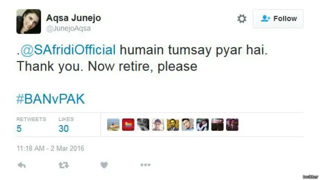 अक़्स जुनेजो @JunejoAqsa ने कप्तान शाहिद अफ़रीदी को संबोधित करते हुए ट्विटर पर लिखा है- हमें तुमसे प्यार है. आपका धन्यवाद. लेकिन अब कृपया संन्यास ले लीजिए.