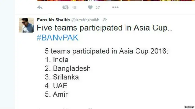 फ़ारुख़ शेख़ @farrukhshaikh ने चुटीले अंदाज़ में लिखा है कि एशिया कप में पाँच टीमों ने हिस्सा लिया- भारत, बांग्लादेश, श्रीलंका, यूएई और मोहम्मद आमिर
