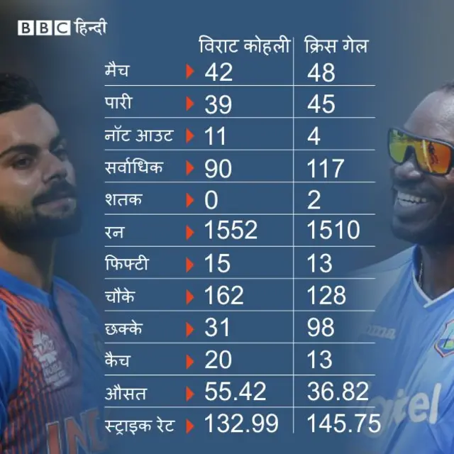 लेकिन इन दो टॉप बल्लेबाज़ों में बेहतर कौन है? साथ ही ये तुलना कितनी सही है क्योंकि उम्र में नौ साल छोटे कोहली जहां अपने करियर के चरम पर हैं, वहीं <link type="page"><caption> गेल</caption><url href="http://www.bbc.com/hindi/india/2016/03/160328_amitabh_gayle_meeting_pkp.shtml" platform="highweb"/></link> का करियर आगे कितना लंबा खिंचेगा, इस पर सवाल हैं.