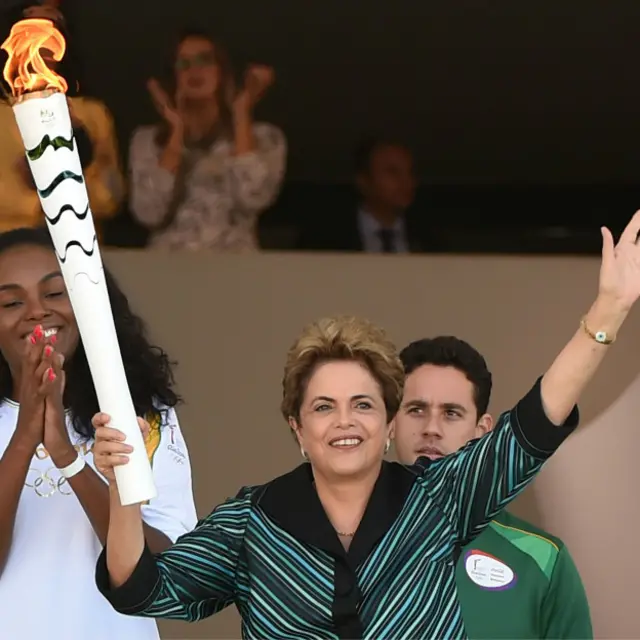ब्राज़ील की राष्ट्रपति जिल्मा रूसेफ ने राजधानी ब्रासीलिया में राष्ट्रपति भवन में मशाल को जलाया और उन्होंने देश में राजनीतिक अस्थिरता के बावजूद शानदार खेलों का वादा किया.